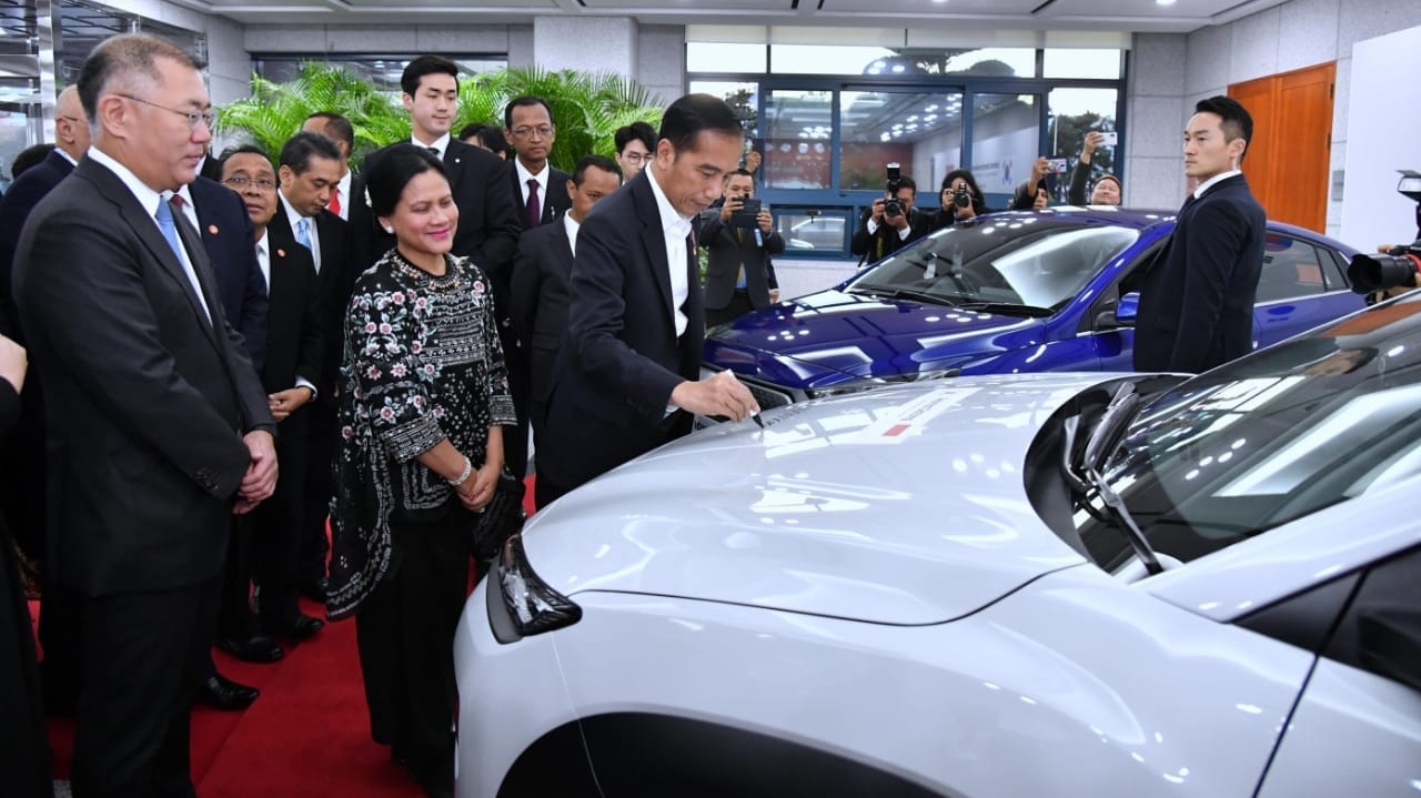 Setibanya di pabrik Hyundai, Presiden Jokowi disambut oleh Executive Vice Chairman Hyundai Motor Company, Chung Eui-sun. Presiden Jokowi kemudian membubuhkan tanda tangan di kap mesin mobil listrik Kona Hyundai.
