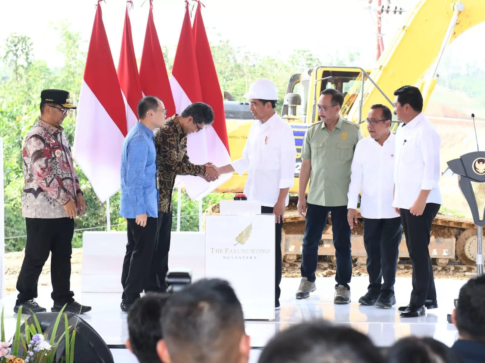 Presiden Joko Widodo melakukan peletakan batu pertama atau groundbreaking apartemen The Pakubuwono Nusantara di Ibu Kota Nusantara (IKN), Kabupaten Penajam Paser Utara, Provinsi Kalimantan Timur pada Kamis, 21 Desember 2023. Dalam sambutannya, Presiden Jokowi menyambut baik pembangunan apartemen yang dinilai memiliki konsep hijau yang selaras dengan konsep IKN.