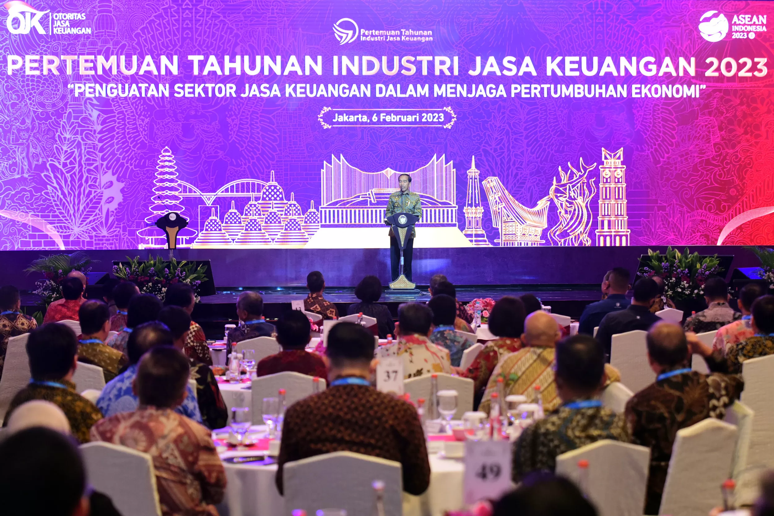 Presiden RI Joko Widodo (Jokowi) menghadiri Pertemuan Tahunan Industri Jasa Keuangan (PTIJK) Tahun 2023 di Hotel Shangri-La, Jakarta, Senin (06/02/2023) pagi.