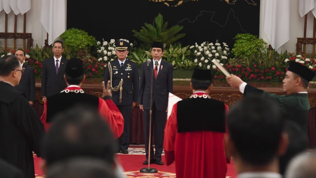 Presiden Joko Widodo menyaksikan pengucapan sumpah calon hakim konstitusi Daniel Yusmic Pancastaki Foekh dan Suhartoyo sebagai hakim konstitusi di Istana Negara, Jakarta, pada Selasa, 7 Januari 2020. Keduanya akan bertugas di Mahkamah Konstitusi (MK) untuk periode 2020 hingga 2025 mendatang.