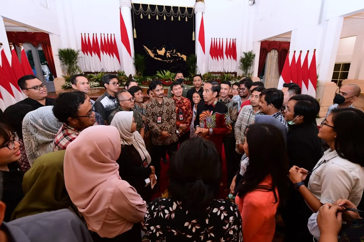 Presiden RI Joko Widodo (Jokowi) bersilaturahmi secara langsung dengan para wartawan istana, di Istana Negara, Jakarta, Selasa (10/01/2023). Dalam pertemuan yang berlangsung santai tersebut, Presiden dan para wartawan dapat berdiskusi secara langsung mengenai isu-isu terkini dari perspektif publik dan juga pemerintah.