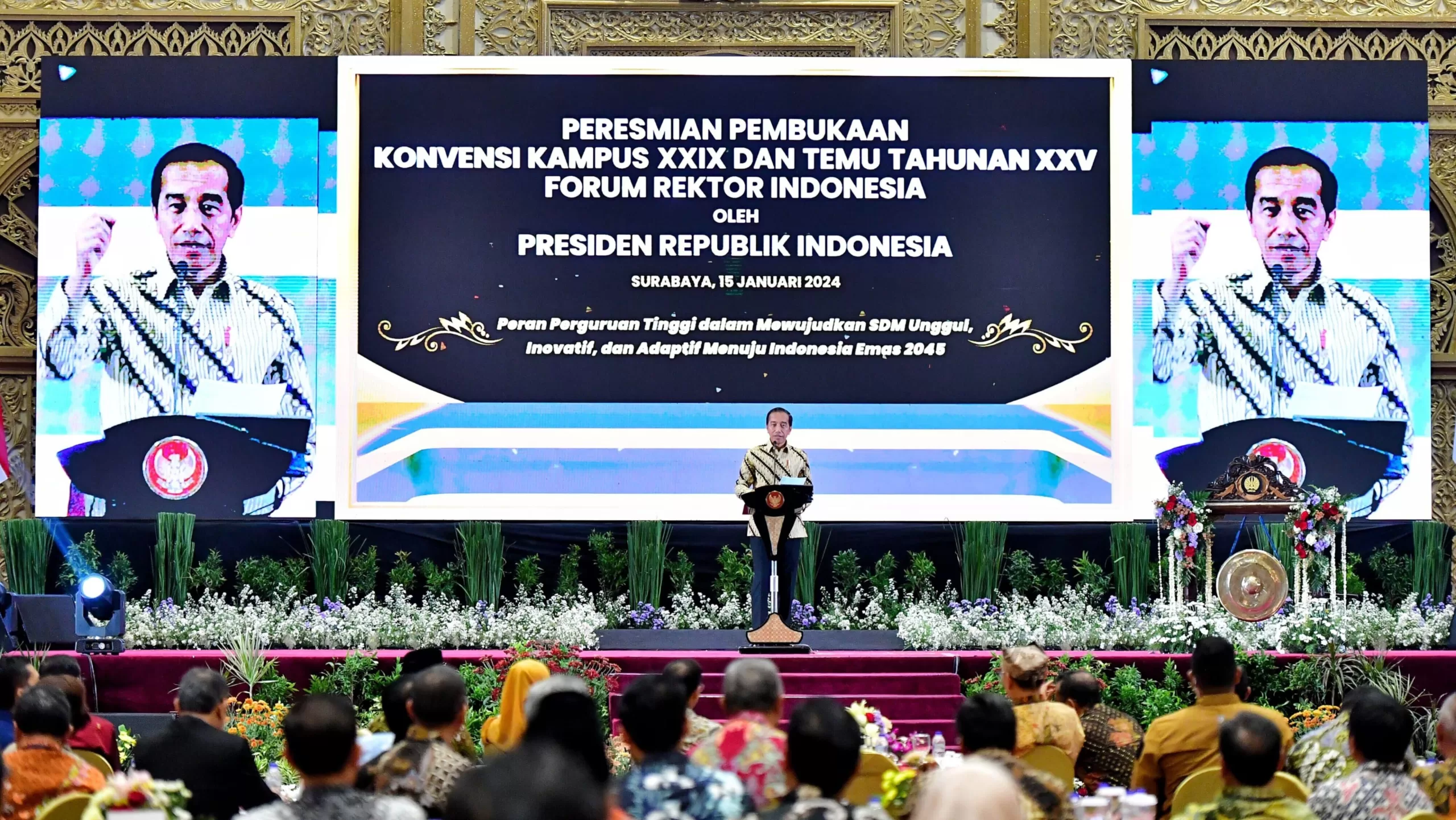 Presiden Joko Widodo secara resmi membuka Konvensi XXIX dan Temu Tahunan XXV Forum Rektor Indonesia yang diselenggarakan di Graha Unesa Kampus II, Kota Surabaya, Provinsi Jawa Timur, pada Senin, 15 Januari 2024. Dalam sambutannya, Presiden menekankan bahwa lembaga pendidikan tinggi memiliki peran strategis dalam mencetak sumber daya manusia (SDM) unggul dan berkualitas.