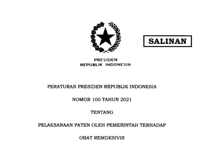 Presiden RI Joko Widodo (Jokowi) menandatangani Peraturan Presiden Republik Indonesia (Perpres) Nomor 100 Tahun 2021 tentang Pelaksanaan Paten oleh Pemerintah terhadap Obat Remdesivir. Peraturan ini dapat diakses pada laman JDIH Sekretariat Kabinet.