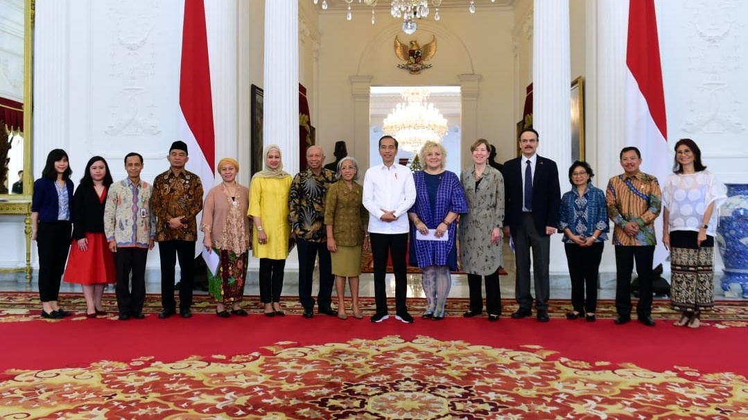 Presiden Joko Widodo menerima kedatangan delegasi Aksi Stop Tuberkulosis (TBC) Dunia di Istana Merdeka, Jakarta, Senin, 9 Desember 2019. Delegasi ini dipimpin langsung oleh Arifin Panigoro selaku Ketua Dewan Pembina Stop TB Patnership Indonesia dan Lucica Dititu selaku Direktur Eksekutif Stop TB Partnership.