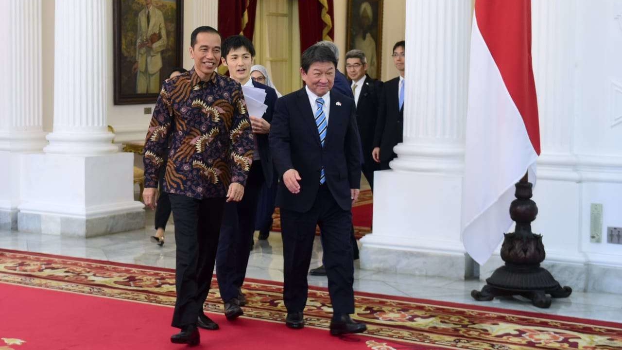Presiden Joko Widodo menerima kunjungan kehormatan Menteri Luar Negeri Jepang, Motegi Toshimitsu beserta delegasi pada Jumat, 10 Januari 2020. Pertemuan tersebut berlangsung di Istana Merdeka, Jakarta.