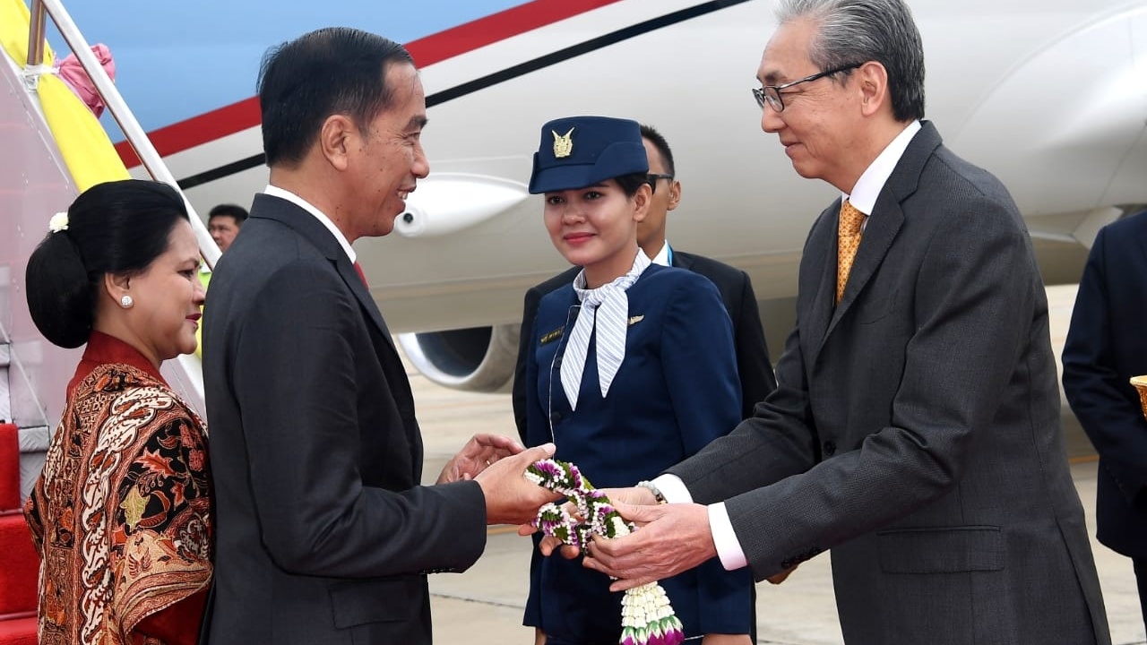 Presiden dan Ibu Iriana disambut oleh Duta Besar Republik Indonesia untuk Kerajaan Thailand Ahmad Rusdi di pintu pesawat. Sementara itu, Deputi Perdana Menteri Thailand urusan hukum Somkit Jatusripitak menyambut di bawah tangga pesawat.