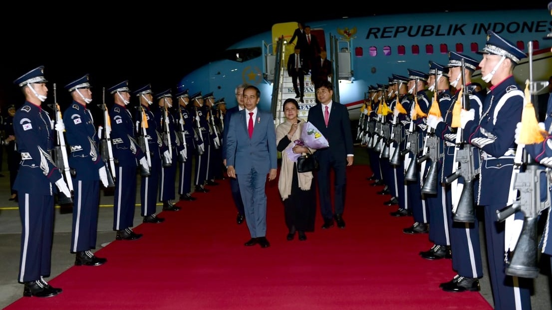 Presiden Joko Widodo dan Ibu Negara Iriana Joko Widodo tiba di Gimhae Air Force Base, Busan, Korea Selatan pada Sabtu malam, 23 November 2019. Pesawat Kepresidenan Indonesia-1 yang membawa Presiden beserta rombongan mendarat pada pukul 20.50 Waktu Setempat (WS) atau pukul 18.50 WIB.