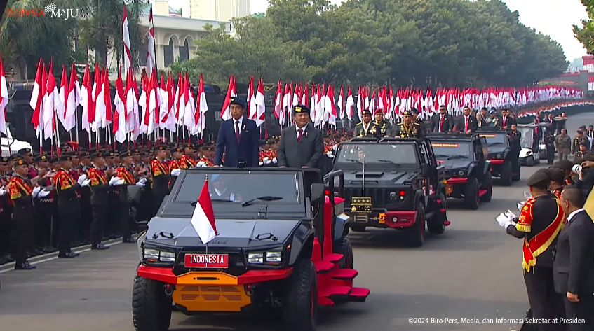 Presiden Joko Widodo (Jokowi) hadiri Apel Kesiapan Pengamanan Pelantikan Presiden dan Wakil Presiden Tahun 2024, di Markas Komando Korps Brigade Mobil Kepolisian Republik Indonesia (Mako Brimob Polri) Kelapa Dua, Kota Depok, Senin (14/10/2024). Saat tiba di Mako Brimob, Presiden Jokowi disambut oleh Menteri Pertahanan Prabowo Subianto, Kapolri Jenderal Listyo Sigit Prabowo, dan Panglima TNI Jenderal Agus Subiyanto.