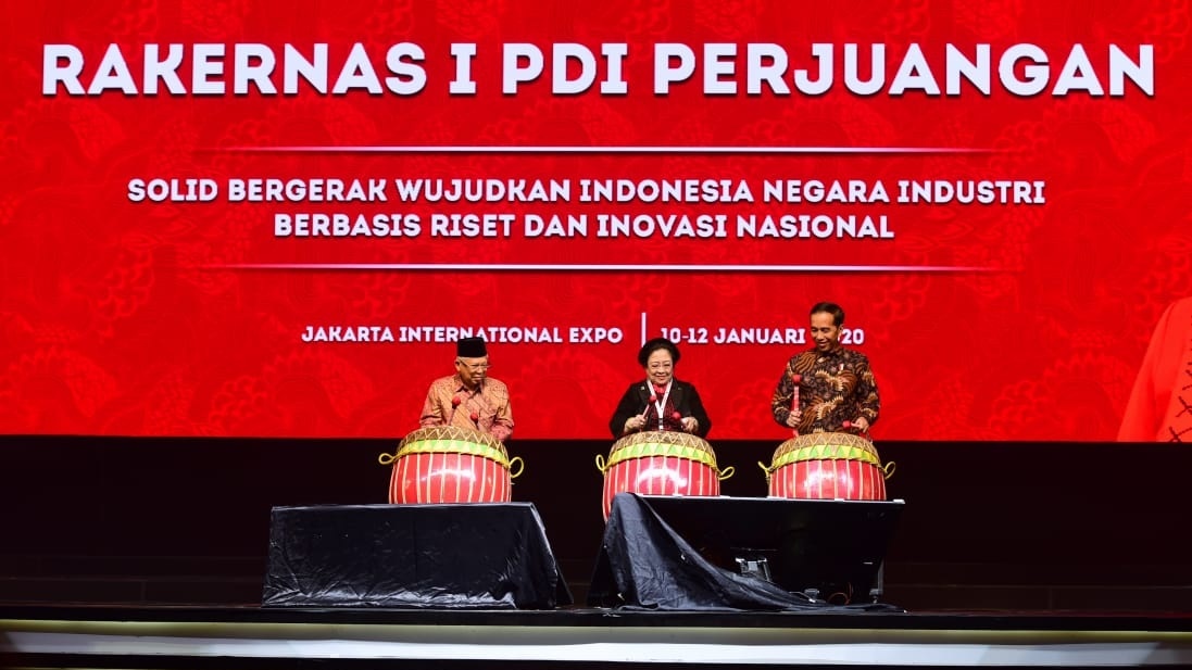 Presiden Joko Widodo meresmikan pembukaan Rapat Kerja Nasional (Rakernas) I Partai Demokrasi Indonesia Perjuangan (PDIP) I di Jakarta International Expo, Jakarta Pusat, pada Jumat, 10 Januari 2020. Acara ini sekaligus peringatan Hari Ulang Tahun (HUT) ke-47 PDIP.