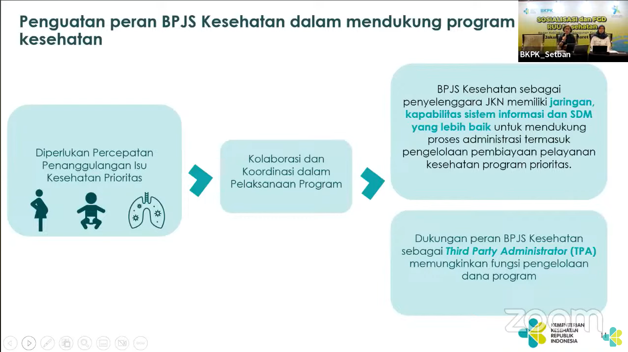 Pada kesempatan ini hadir Sekretaris Jenderal Kementerian Kesehatan Kunta Wibawa Dasa Nugraha. Kunta menjelaskan yang diatur pada RUU Kesehatan ini adalah BPJS Kesehatan. Ia menekankan bahwa independensi BPJS Kesehatan sudah jelas. “Yang ingin diperkuat adalah koordinasi antarlembaga yang mengatur kesehatan, agar inline dan tidak tumpang tindih. Akan ada komite atau forum untuk koordinasi agar komunikasi lancar dalam mendiskusikan sektor kesehatan,” jelasnya.
