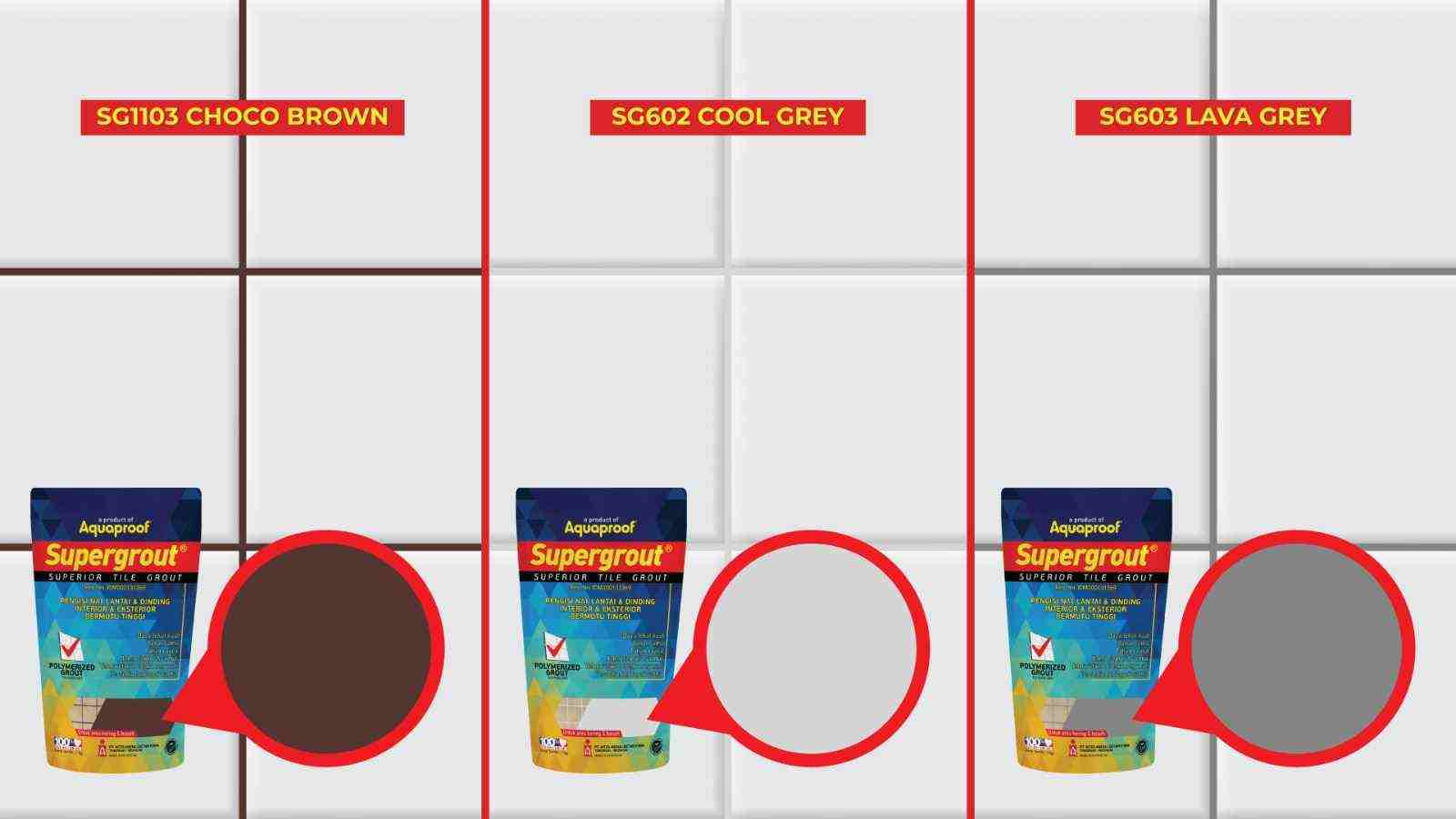 Supergrout SG602 Cool Grey merupakan warna abu muda dan SG603 Lava Grey merupakan warna abu yang lebih tua; keduanya dapat disesuaikan dengan ubin rumah minimalis yang biasanya dominan warna abu. Selain itu, cocok juga dikombinasikan dengan ubin dominan warna putih.