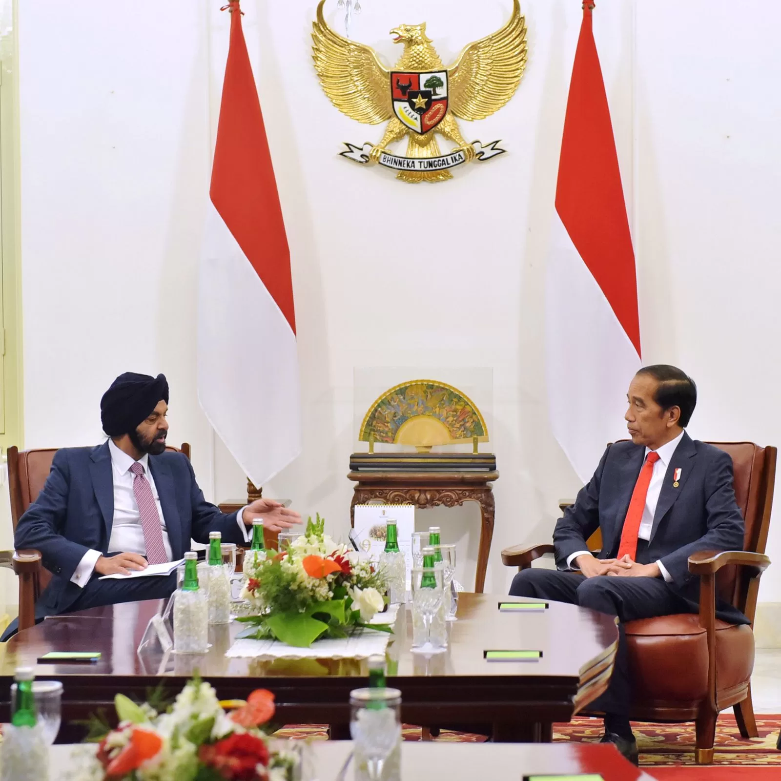 Presiden RI Joko Widodo (Jokowi) menerima Presiden Bank Dunia Ajay Banga beserta delegasi di Ruang Jepara, Istana Merdeka, Jakarta, Senin (04/09/2023). Dalam pertemuan tersebut, Presiden Jokowi menyampaikan sejumlah isu untuk dibahas bersama dengan Presiden Banga, termasuk soal reformasi sistem keuangan global.