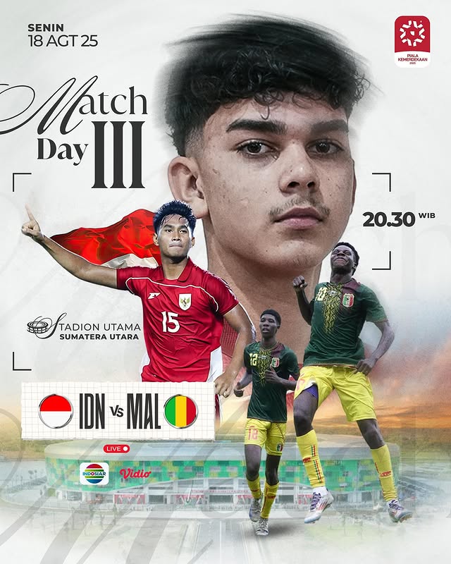 Timnas Indonesia U-17 akan melakoni laga pamungkas Piala Kemerdekaan 2025 dengan menghadapi Mali U-17. Pertandingan penentuan juara ini dijadwalkan berlangsung malam ini, Senin (18/8/2025), di Stadion Utama Sumatera Utara. Kick-off dimulai pukul 20.30 WIB dan bisa disaksikan melalui siaran langsung Indosiar serta live streaming di Vidio.com.