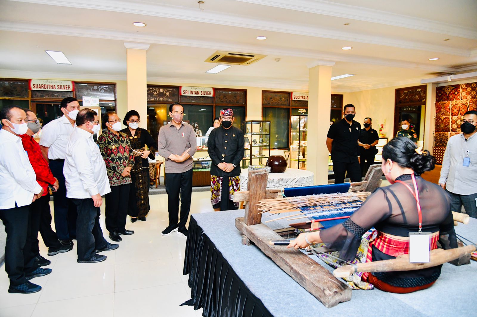 Selama peninjauan, Presiden Jokowi tampak dipandu oleh Ketua Dewan Kerajinan Nasional Daerah (Dekranasda) Provinsi Bali, Ibu Ni Luh Putu Putri Suastini Koster.