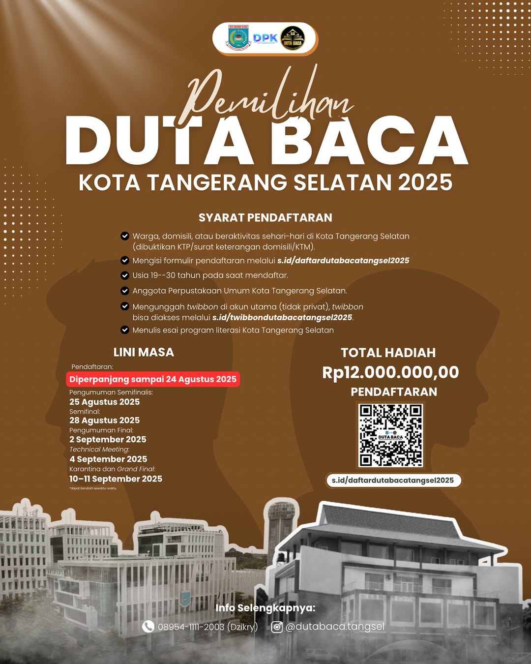 Pemerintah Kota Tangerang Selatan melalui Dinas Perpustakaan dan Kearsipan (DPK) resmi memperpanjang masa pendaftaran Pemilihan Duta Baca Kota Tangsel 2025.