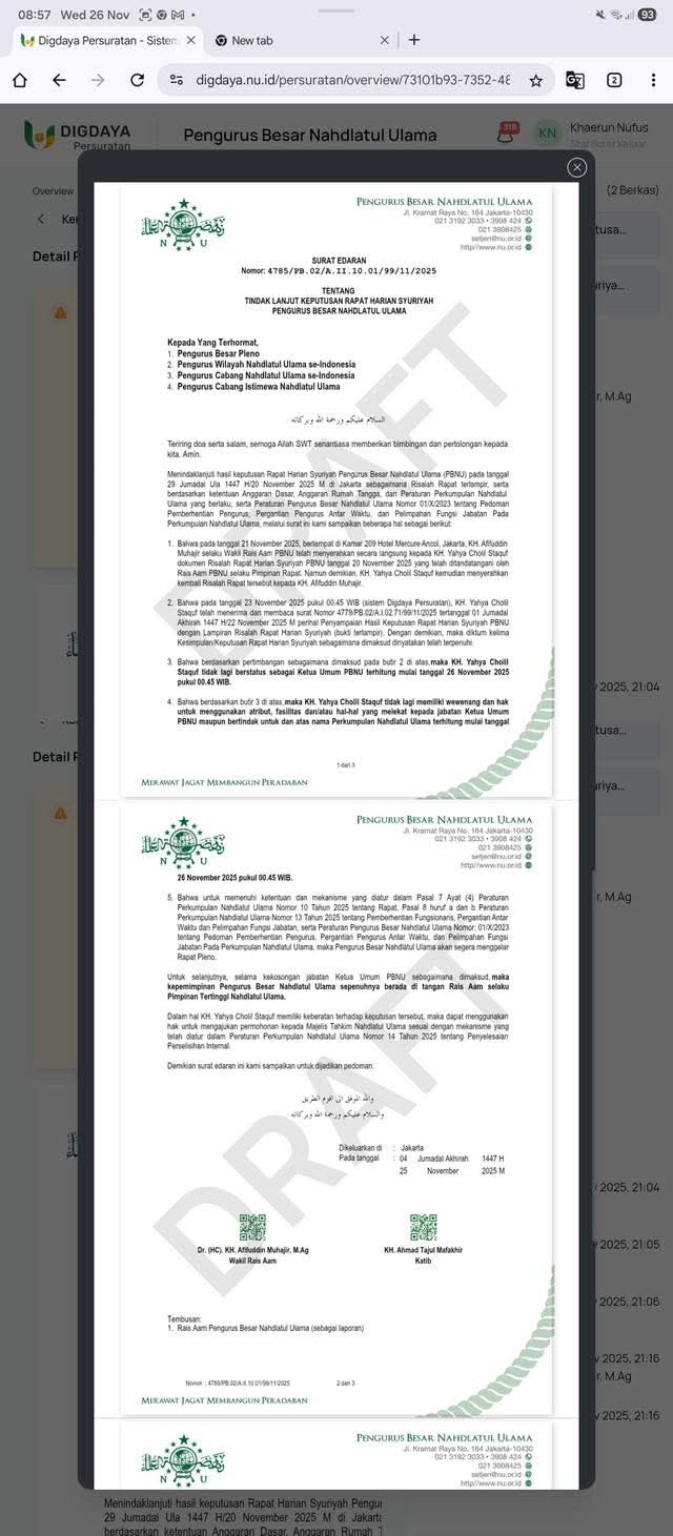 Tokoh Nahdlatul Ulama, Ulil Abshar Abdalla, menegaskan bahwa surat Syuriyah PBNU yang tengah beredar saat ini hanya merupakan DRAFT dan belum sah sebagai dokumen resmi kelembagaan. Penegasan ini disampaikan Ulil untuk meluruskan kesimpangsiuran informasi yang mulai menyebar luas di publik.