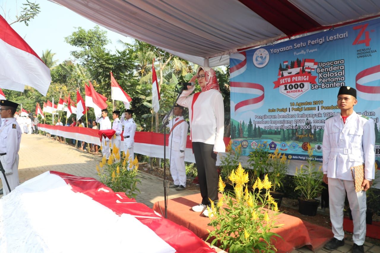 Walikota Tangerang Selatan (Tangsel) Airin Rachmi Diany menjadi inspektur upacara kolosal pengibaran bendera merah putih di Situ Parigi, Pondok Aren, Tangsel pada Minggu, (18/8/2019). Upacara bendera tersebut dihadiri oleh Camat, Lurah, organisasi masyarakat, organisasi kepemudaaan, akadenisi, pelajar dan lainnya.