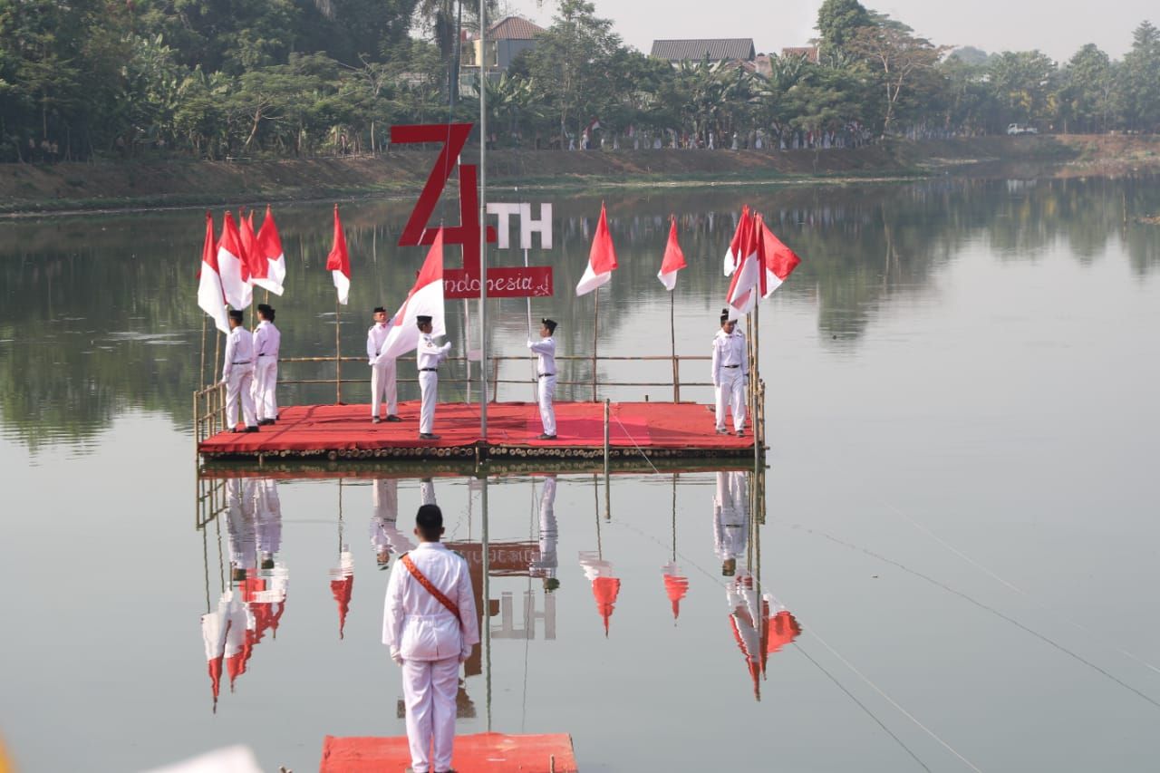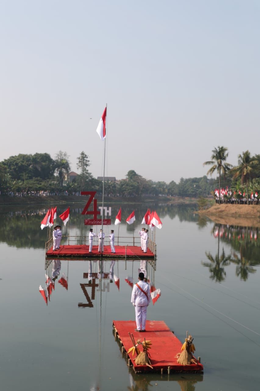 “Suatu yang biasa menaikan bendera di daratan, tetapi di Situ Parigi dengan formasi kekompokan yang luar biasa semangat dan fokus mengibarkan bendera bukan sesuatu yang mudah. Butuh kekompakan, kerja keras, bagaiamana formasi dilakukan pengibar bendera dan menaikan bendera merah putih,” kata Airin.