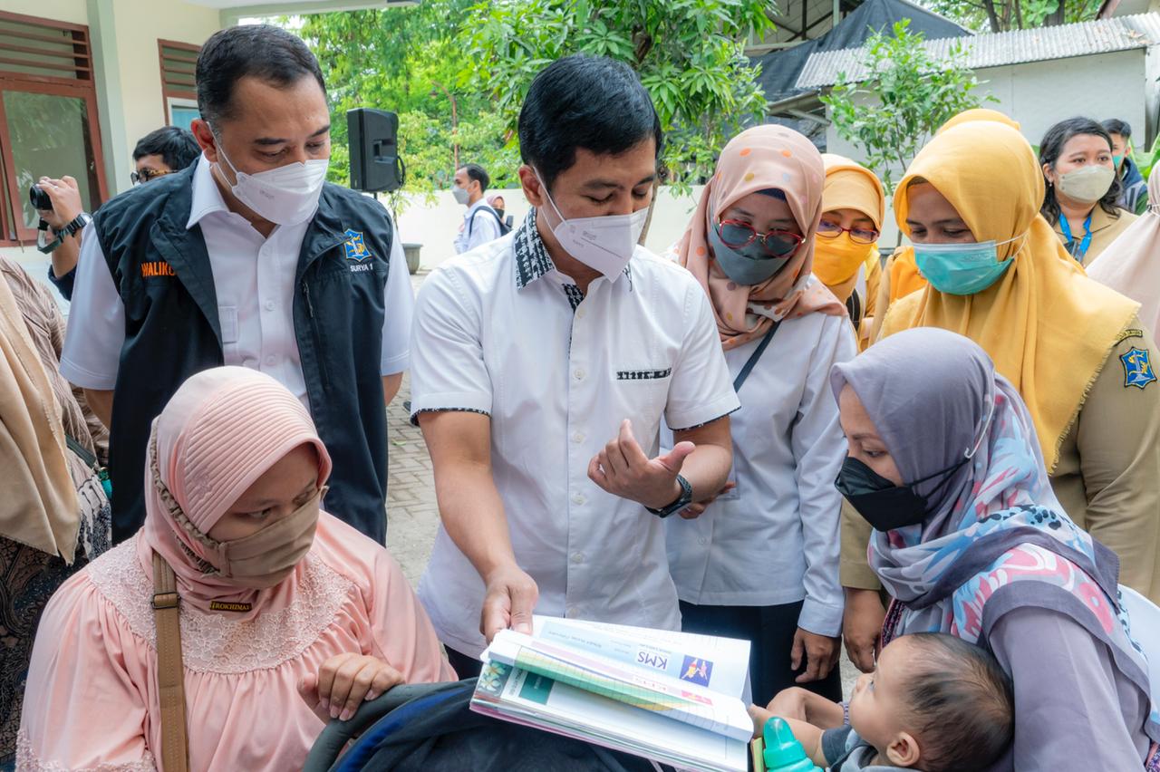 Wakil Menteri Kesehatan Dante Saksono Harbuwono didampingi Walikota Surabaya Eri Chayadi meninjau pelayanan kesehatan yang ada di Posyandu Prima Jambangan, Kota Surabaya, Jawa Timur pada Senin (1/8).