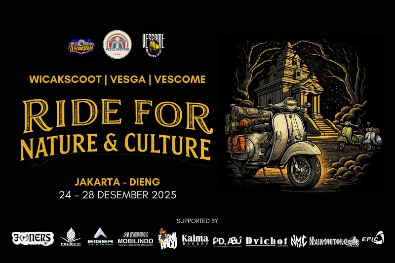 Sejumlah komunitas pecinta Vespa dari Tangerang Selatan akan menggelar kegiatan touring bertajuk “Ride for Nature & Culture” dengan rute Jakarta–Dieng, yang dijadwalkan berlangsung pada 24–28 Desember 2025. Kegiatan ini diinisiasi oleh kolaborasi tiga komunitas scooter, yakni Wicakscoot, Vesga Scooter, dan Vescome Tangsel.