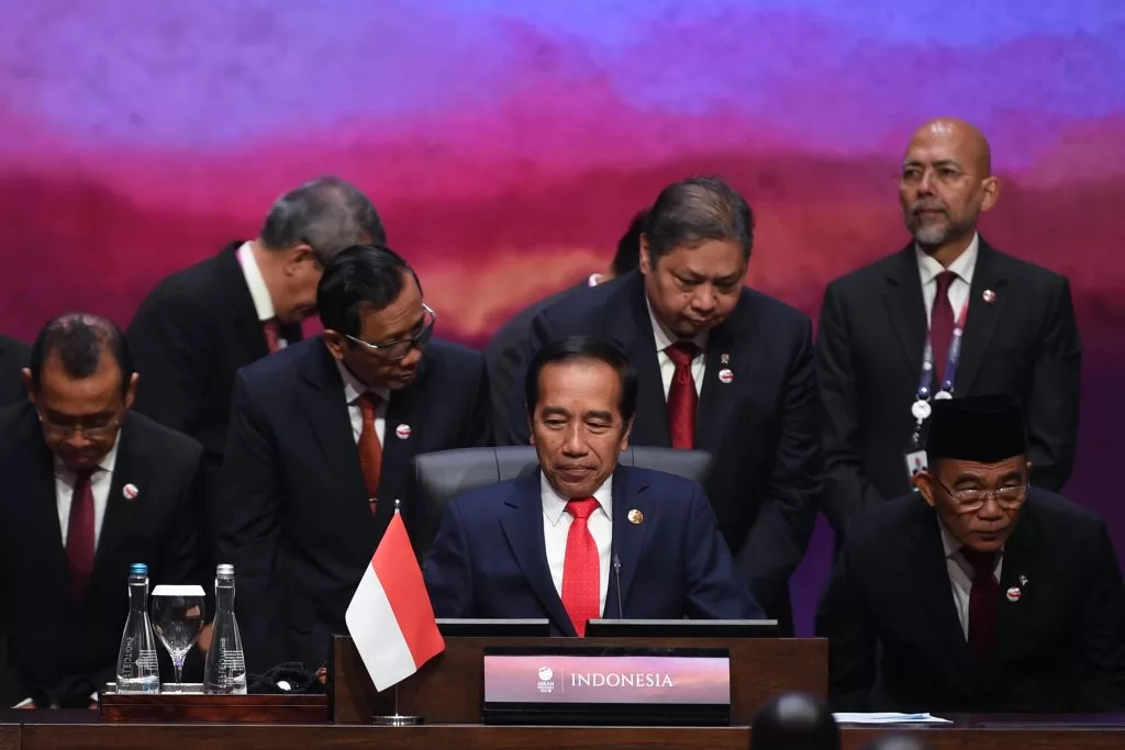 Presiden Jokowi didampingi Menko Polhukam Mahfud MD, Menko Perekonomian Airlangga Hartarto, Menko PMK Muhadjir Effendi, dan Mensesneg Pratikno saat mengikuti Sesi Plenary KTT ke-43 ASEAN, di Jakarta Convention Center (JCC), Jakarta, Selasa (05/09/2023). (Foto: Media Center KTT ASEAN 2023/M Agung Rajasa/pras)