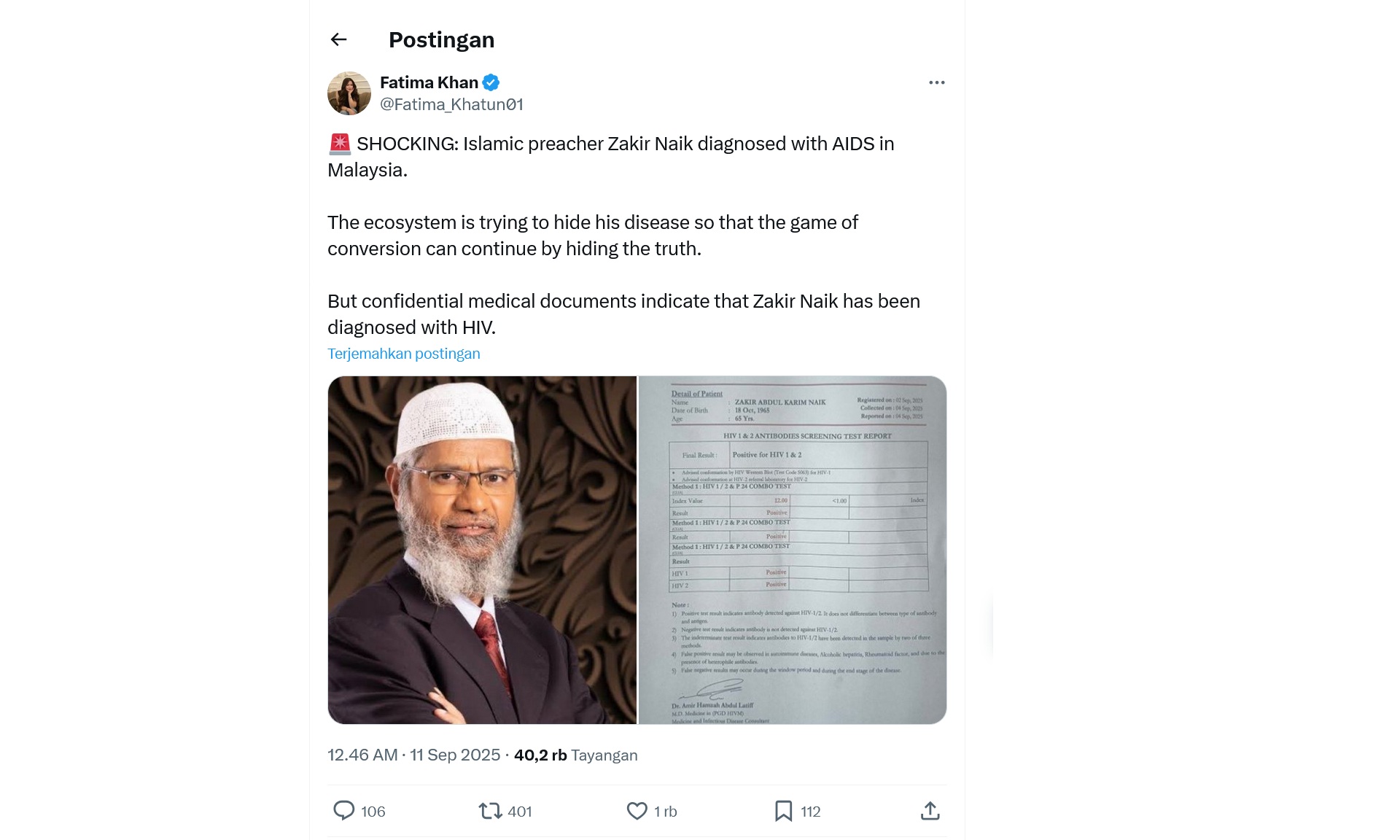 Sebuah postingan di platform X (dulu Twitter) yang diunggah oleh akun @Fatima_Khatun01 menghebohkan warganet. Dalam unggahannya, ia menuliskan klaim mengejutkan bahwa pendakwah internasional asal India, Zakir Naik, didiagnosis mengidap AIDS di Malaysia.